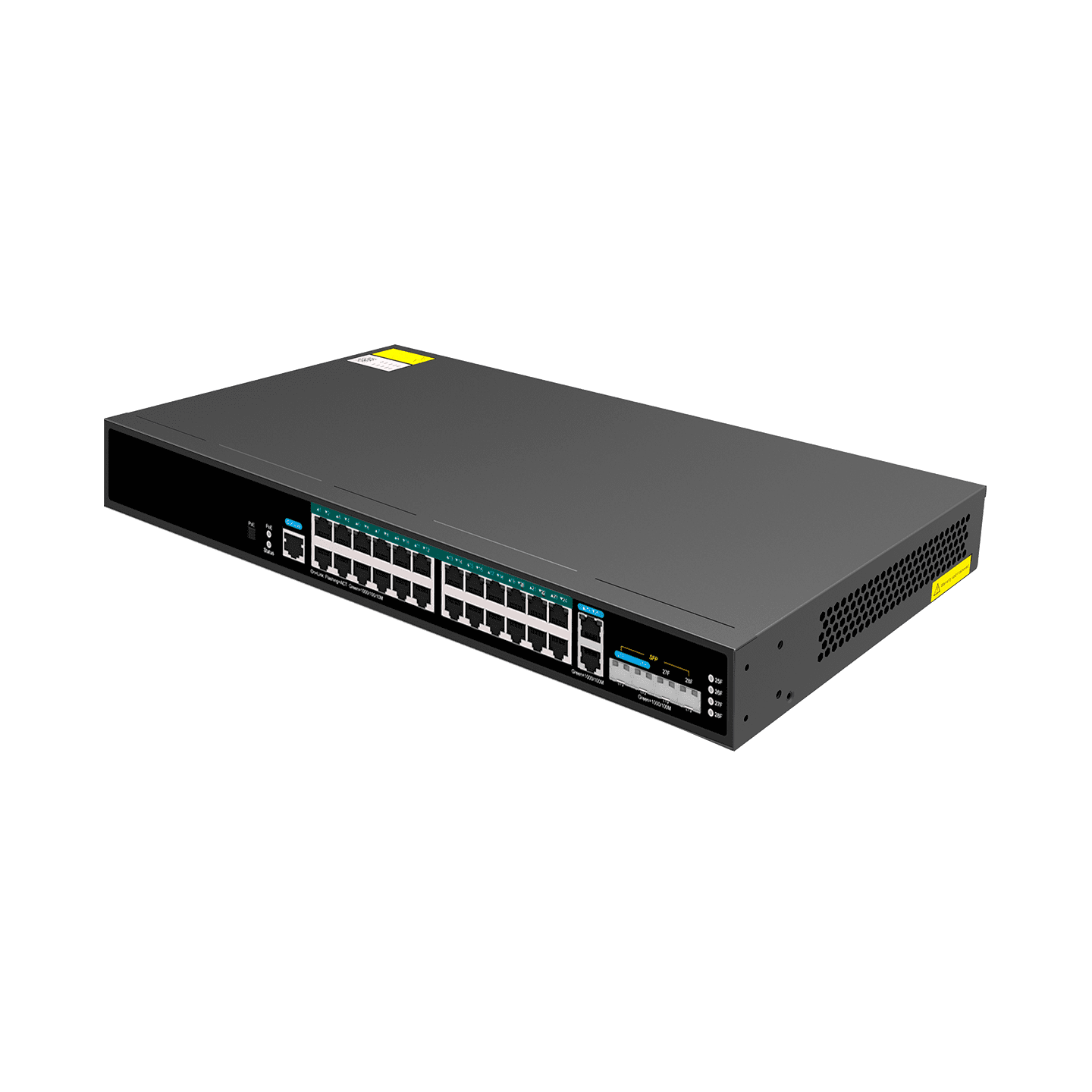 Incluye 24 puertos Gigabit PoE+ (802.3af/at) y 4 puertos SFP uplink, con un potente presupuesto PoE de 370W, ideal para proyectos medianos y grandes.